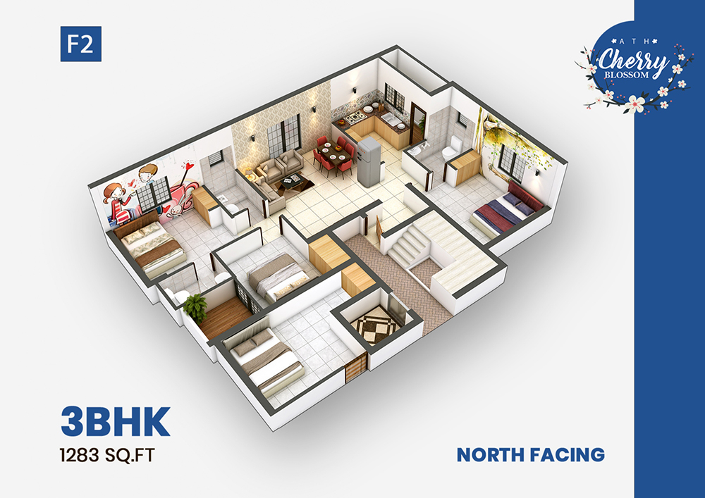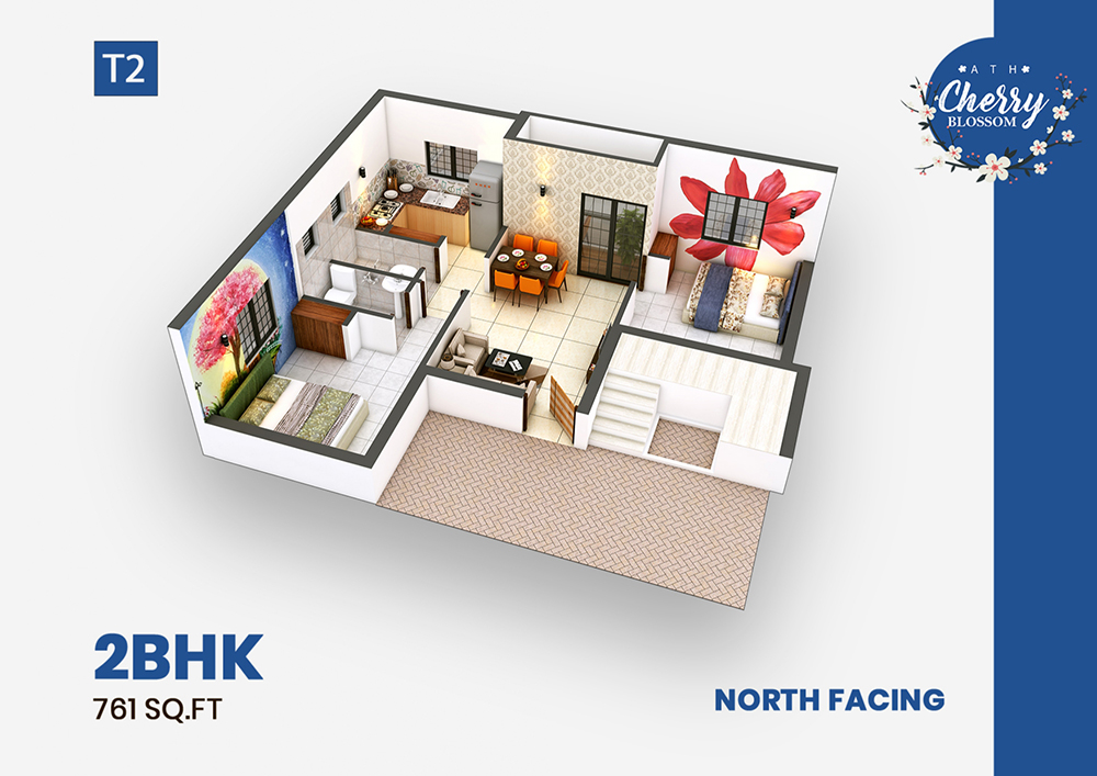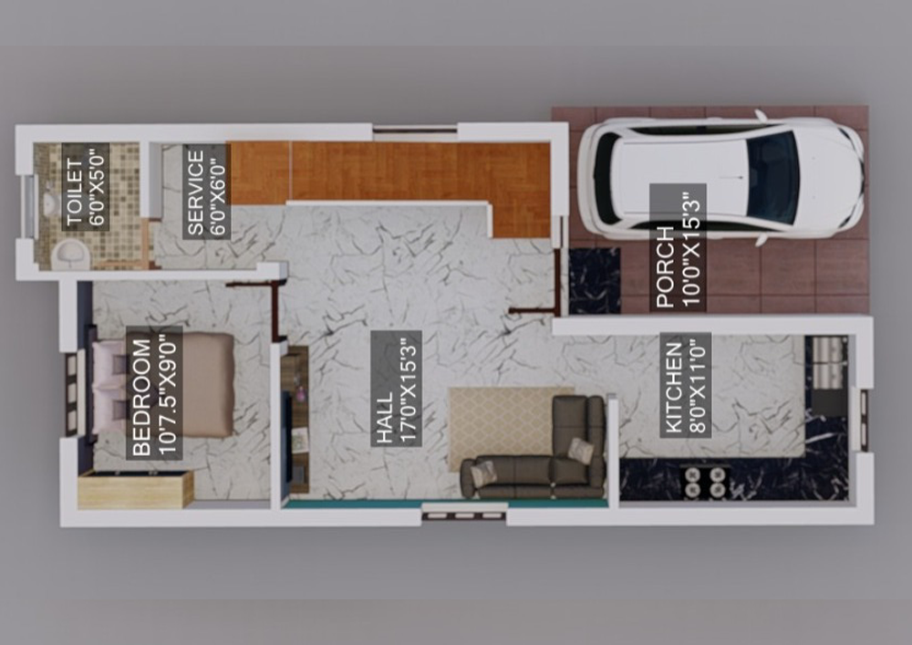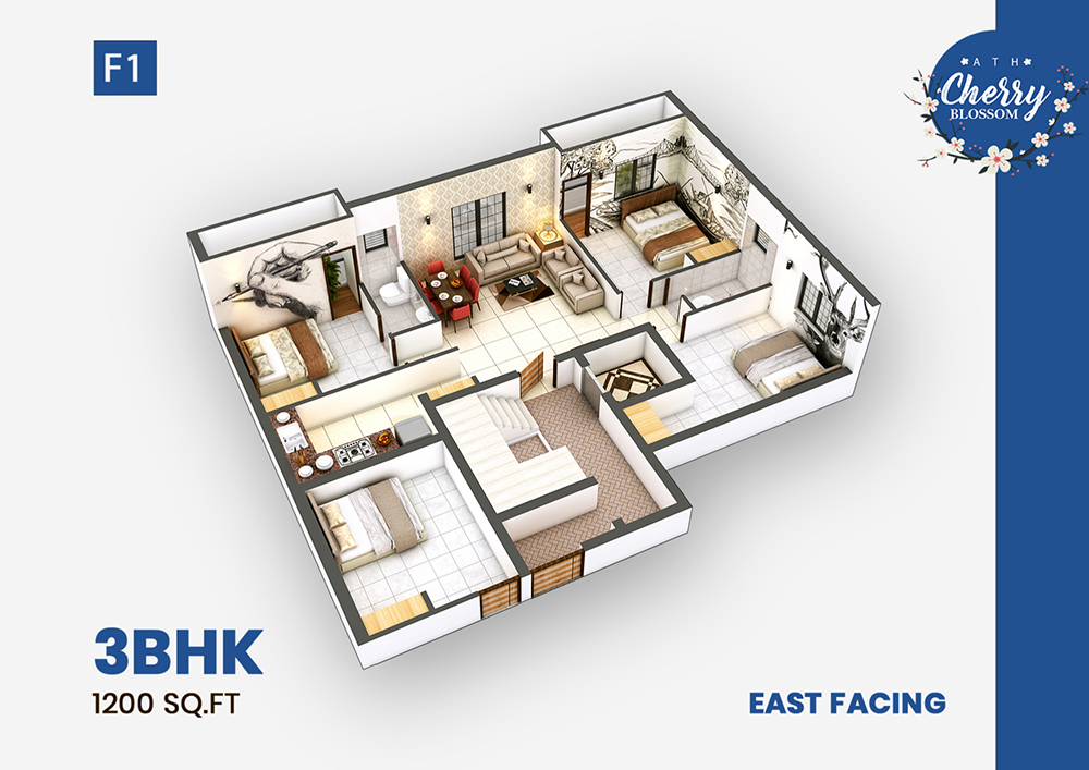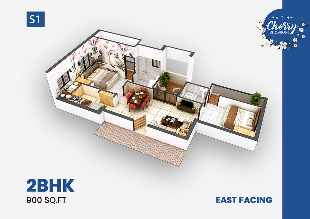 Flooring in Living, dining, kitchen and bed room will have 4x2 vitrified tiles.
